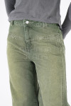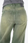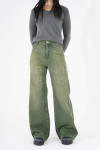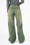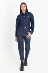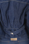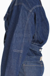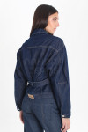 Campera jean rígido azul estático con cinto en espalda.