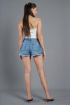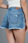 Mini short, fabricado en denim rígido color celeste, tiene roturas y bigotes.